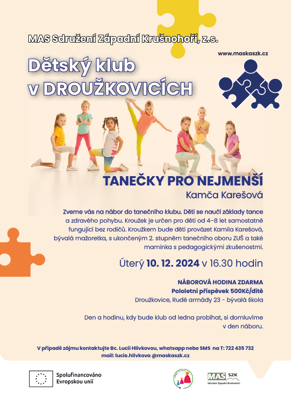 Taneční klub zve děti ve věku od 4 do 8 let na nábor, který se uskuteční 10. prosince 2024 v 16:30 hodin v bývalé škole v Droužkovicích. Děti se naučí základy tance a zdravého pohybu pod vedením Kamily Karešové. Náborová hodina je zdarma a pololetní příspěvek činí 500 Kč. Den a čas pravidelných lekcí budou domluveny na náboru. V případě zájmu kontaktujte Bc. Lucii Hlivkovou.